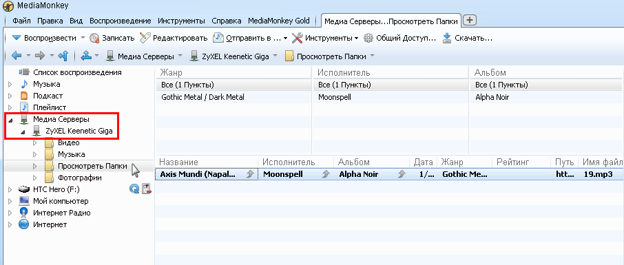 Ниже представлен скриншот использования программы MediaMonkey на компьютере с ОС Windows для доступа к ресурсам USB-накопителя через медиасервер DLNA.