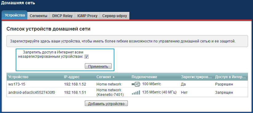 В меню Домашняя сеть на вкладке Устройства появилось поле Запретить доступ к Интернету всем незарегистрированным устройствам. Установив галочку в данном поле и нажав кнопку Применить, вы запретите доступ к Интернету всем незарегистрированным устройствам, и только зарегистрированные устройства смогут работать в Интернете.