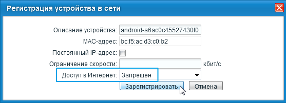 А можно запретить доступ в Интернет только избранным зарегистрированным устройствам. Щелкните по нужной записи в списке подключенных устройств. В появившемся окне Регистрация устройства в сети в поле Доступ в Интернет установите значение Запрещен. В этом случае доступ в Интернет будет заблокирован только конкретному устройству.