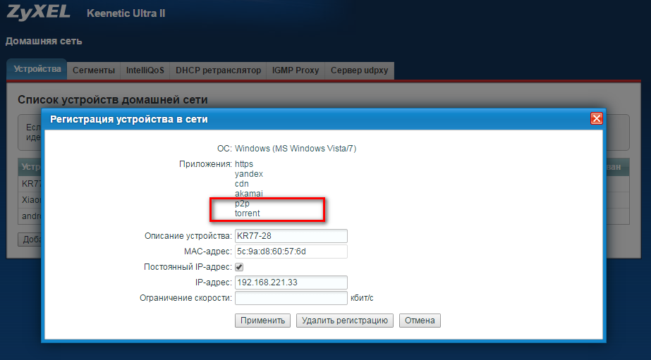 1. Необходимо запустить торрент-клиент на хосте в локальной сети. В меню Домашняя сеть > Устройства система для этого хоста должна определить тип трафика torrent и p2p.